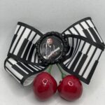 Johnny cash sløjfe Piano. sløjfen er lavet med et fedt bånd tangenter fra et klaver og så er der i midten billede af Johnny Cash samt smukke kirsebær / cherrys. Altså denne sløjfe er spækket med rockabilly, rock n Roll, 60erne og musik!